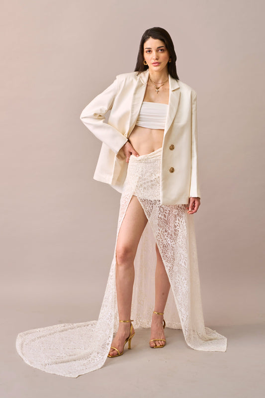 Cloud Drape - Ivory Oversized Jacket with Bralette & Lace Maxi Skirt 3-piece Set