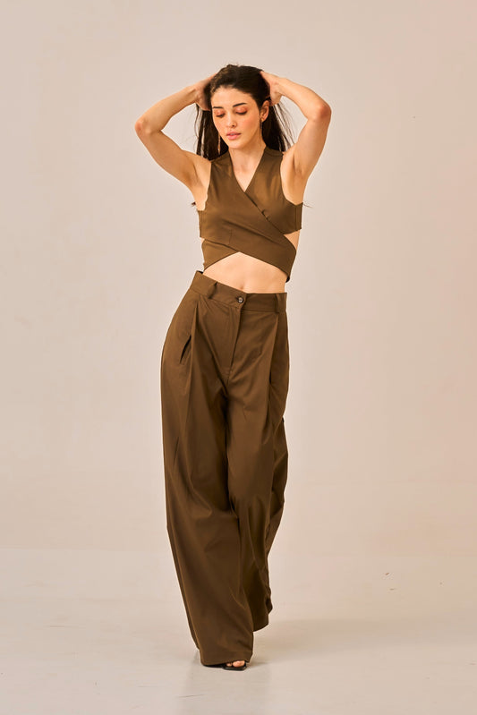 Cocoa Drape - Olive Brown High-Waisted Wide-Leg Trousers for Women