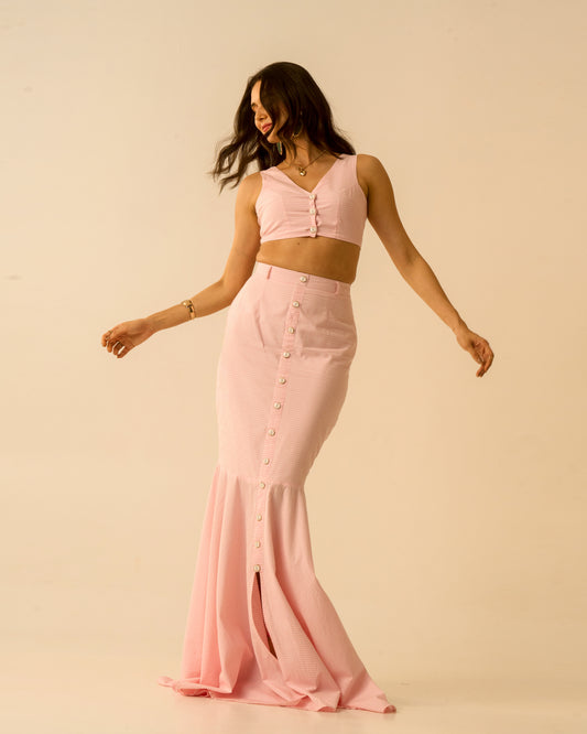 Sweet Desire Pink Gingham Co-ord Set for Women – Sleeveless V-Neck Crop Top & Mermaid Skirt
