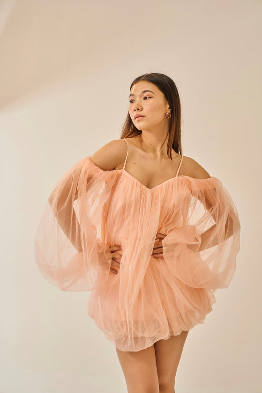 Barely Blushed – Peach Off-Shoulder Tulle Mini Dress for Women
