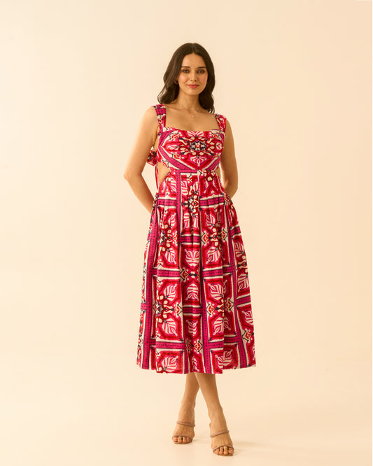 Floral Bliss Fuchsia Pink Cut-Out Midi Dress for Women – Sleeveless Tie-Back Floral Print Dress