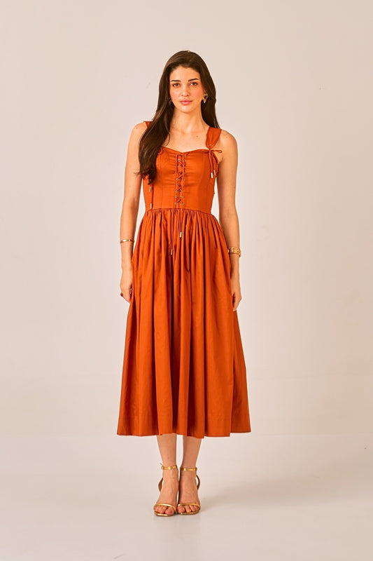 Burnt Honey Dress - Rust Orange Corset Style Midi Dress