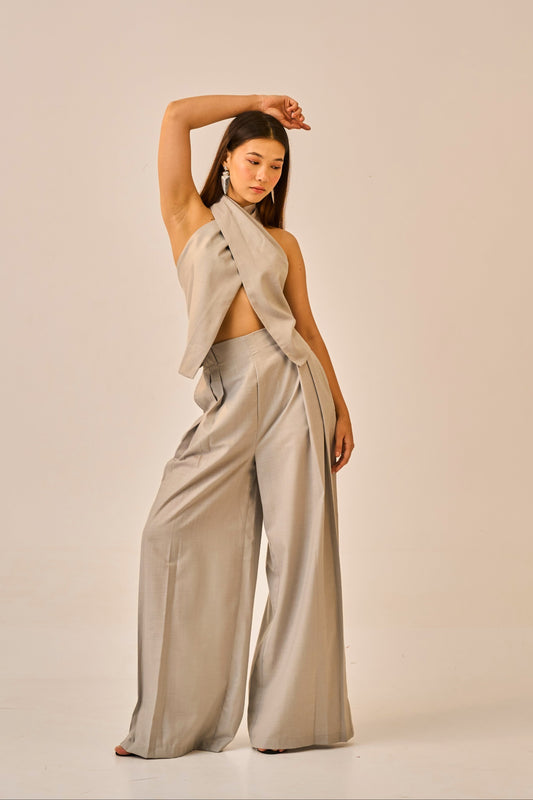 Quiet Current – Grey Halter Wrap Top with Wide-Leg Trousers Women's Coord Set