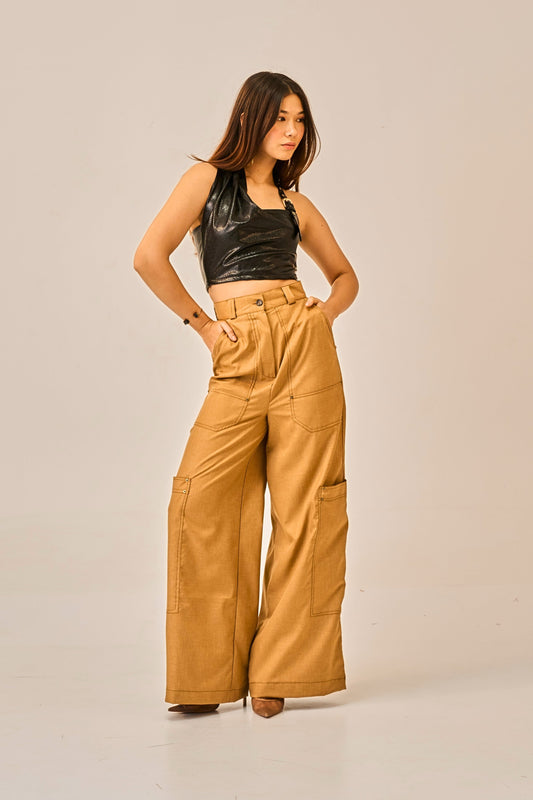 Burnt Ember - Faux Leather Halter Crop Top & High Waist Utility Trousers Coordset