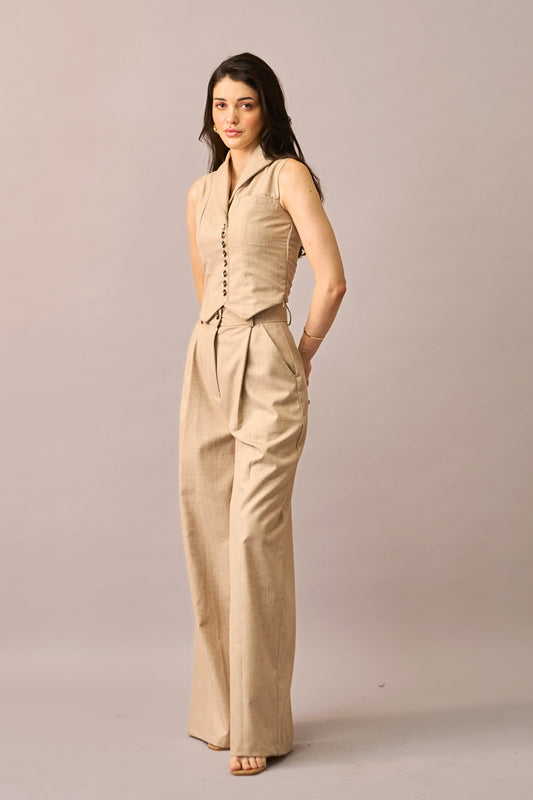 Soft Sand - Beige Waistcoat & Wide-leg Trousers Coordset for Women