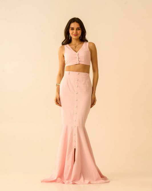 Sweet Desire Pink Gingham Co-ord Set for Women – Sleeveless V-Neck Crop Top & Mermaid Skirt