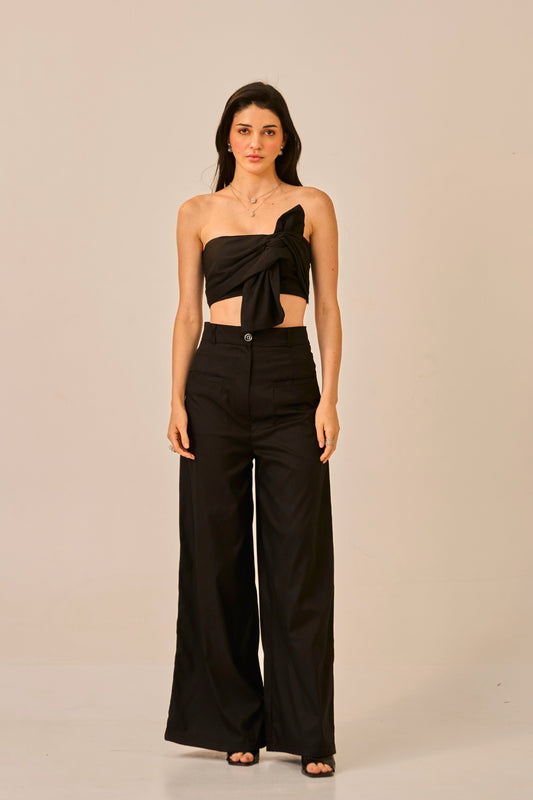 Knot Theory – Black Bandeau Crop Top & High Waist Flared Trousers Coordset for Women