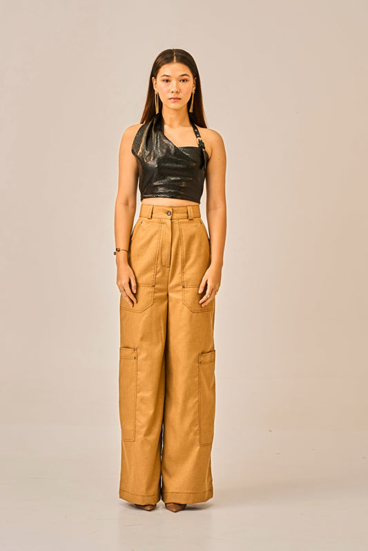 Golden Embrace Beige One-Shoulder Knot Crop Top for Women – Asymmetrical Neck Line