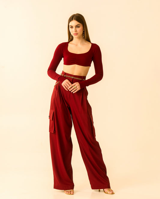 Velvet Flame Maroon Long Sleeve Knit Crop Top with Ruched Front For Women