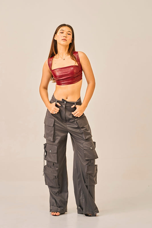 Crimson Steel - Textured Faux Leather Crop Top and Multi-pocket Cargos for Women