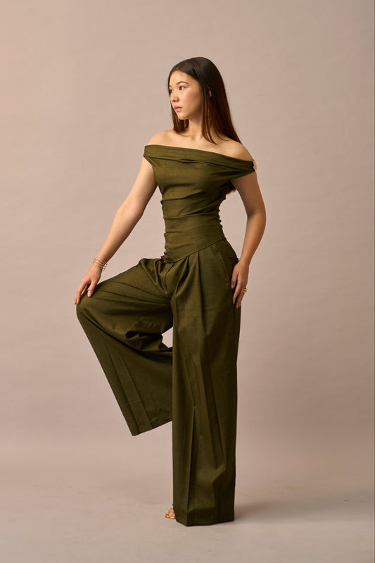 Moss Melt – Olive Off-Shoulder Top & Wide Leg Trousers Women Co-ord Set