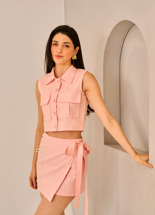 Cotton Pop – Pink Utility Crop Shirt & Wrap Skirt Coord Set for Women