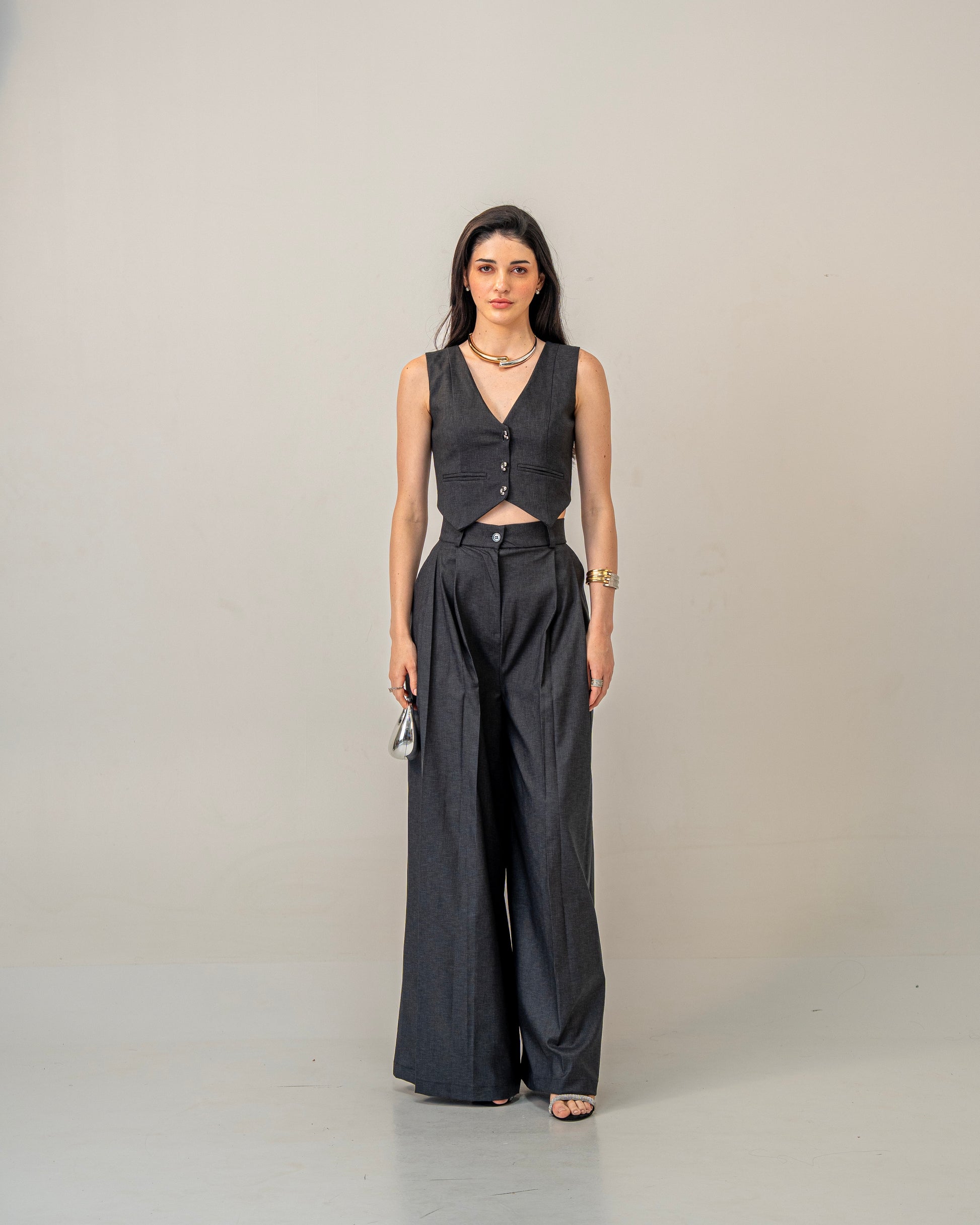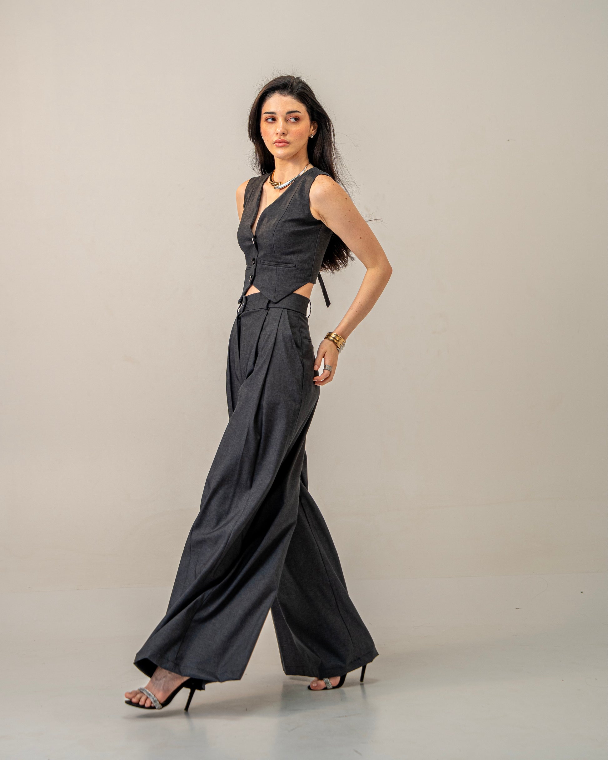 The foundation of quiet luxury. The Charcoal Trousers sit firmly on the waist, draping into a soft yet powerful wide-leg silhouette. Front pleats add structure while deep side pockets keep it grounded in ease — a timeless essential that pairs as beautifully with a shirt as it does with its matching waistcoat. Made from premium viscose blend this one is for the keeps!