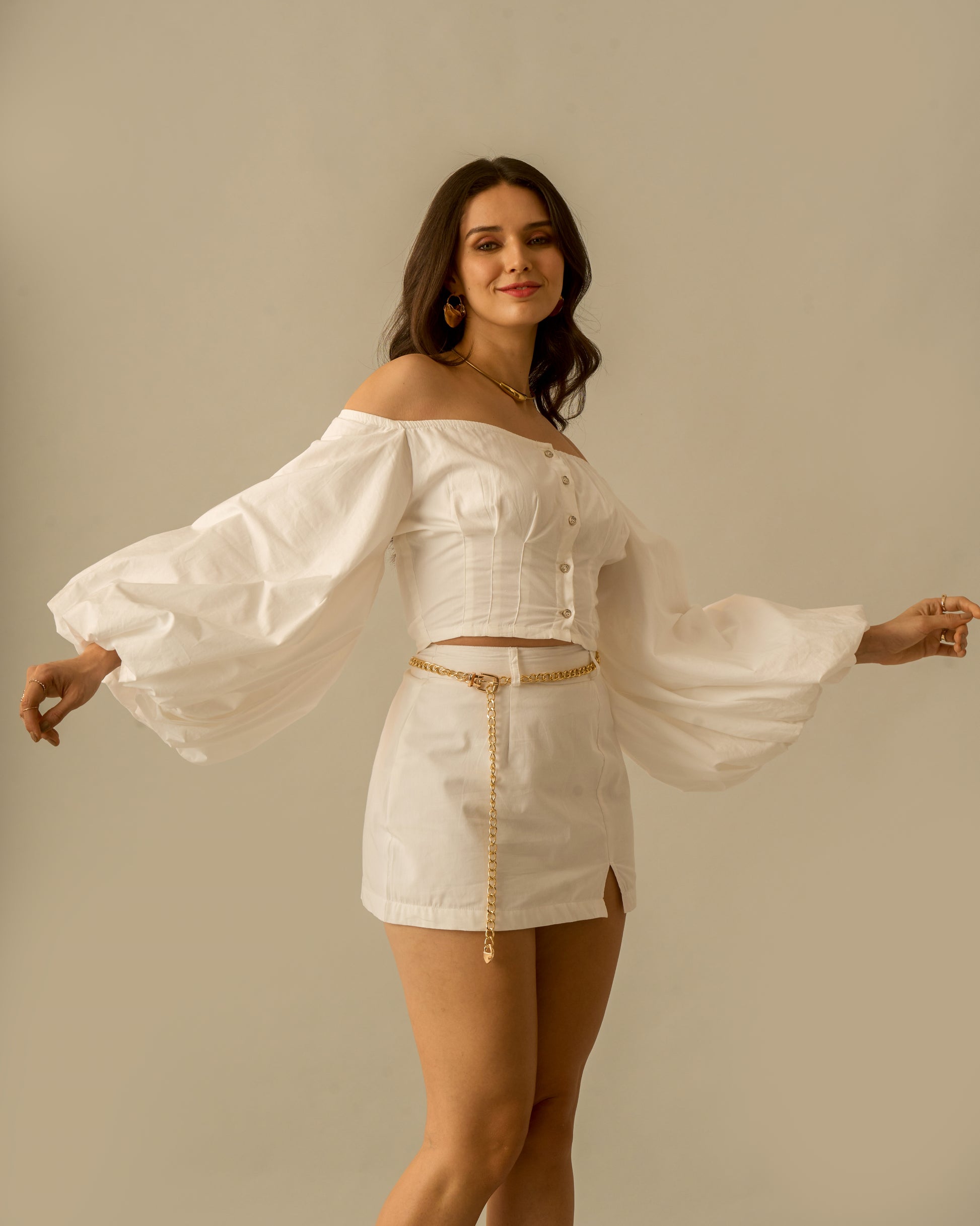 Make an unforgettable entrance in our white puff sleeve crop top — the standout piece from the Crystal Moon collection. Featuring voluminous off-shoulder sleeves, a structured corset-style bodice, and button detailing, this top is equal parts drama and delicacy.