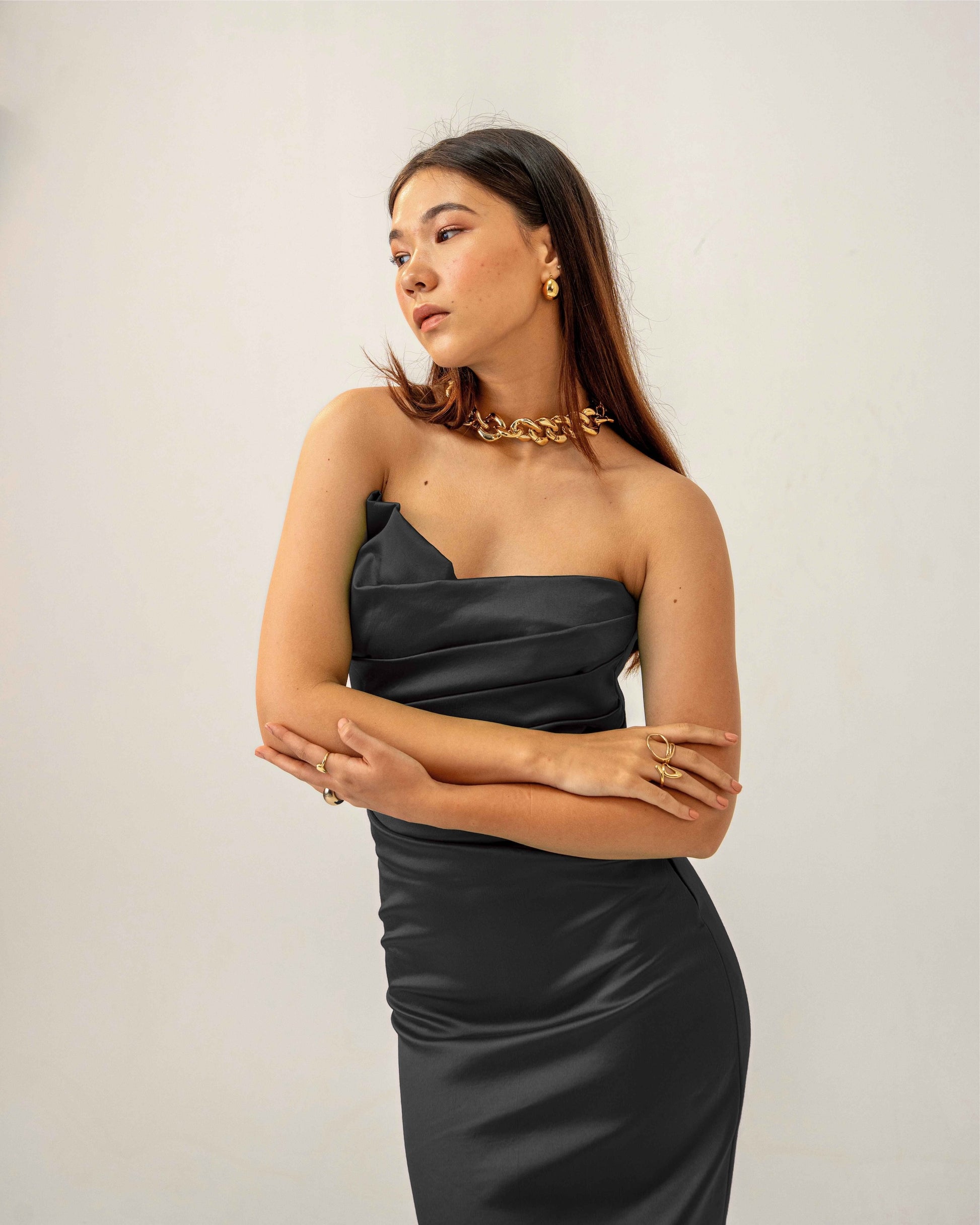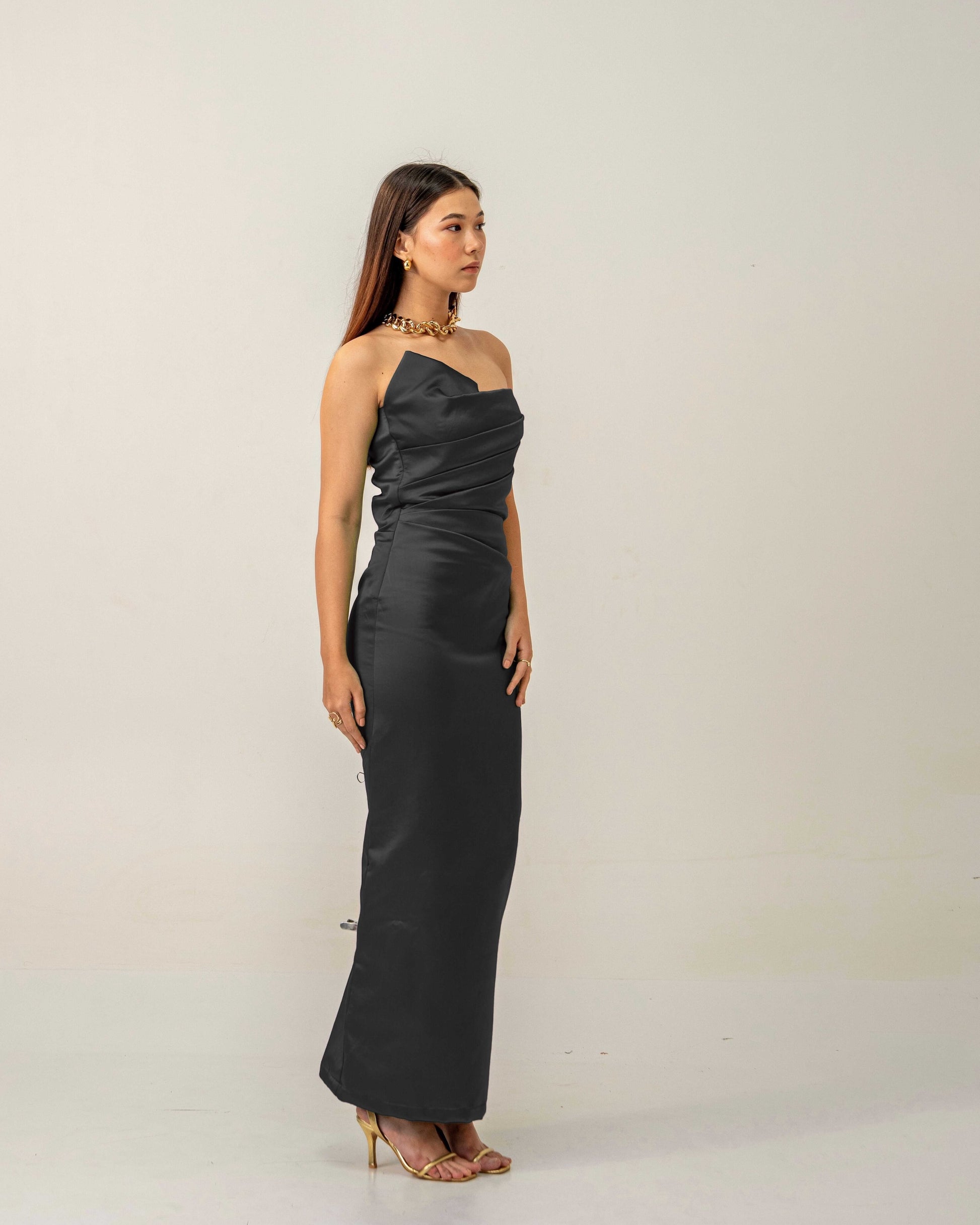 A moment that catches light — and holds it. Black Hour is an ode to modern femininity, where precision meets sensuality. The gown is crafted in lustrous satin that moves like liquid and shapes like sculpture. Its asymmetric neckline and ruched bodice create quiet drama, while the floor-length column silhouette elongates with effortless grace.