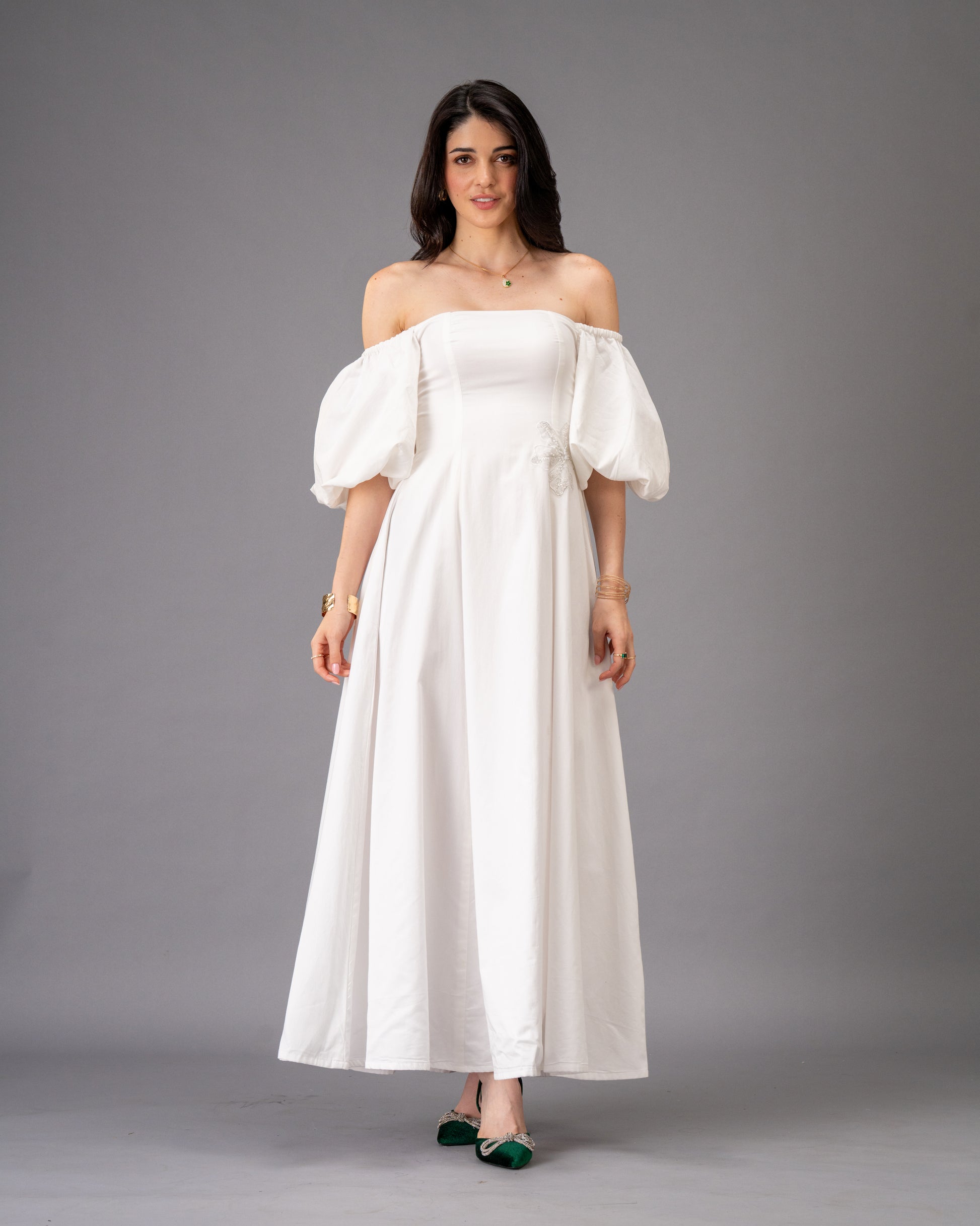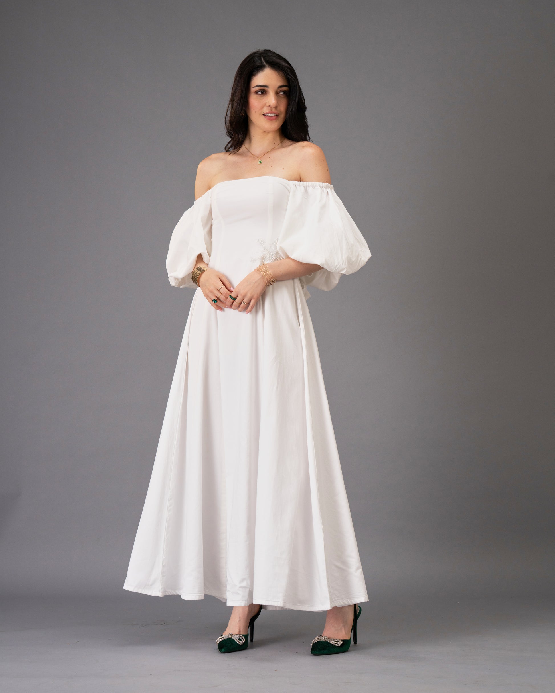 A soft white maxi dress made from premium pure cotton satin that feels as effortless as it looks, designed with an off-shoulder neckline that sits gently across the collarbones.