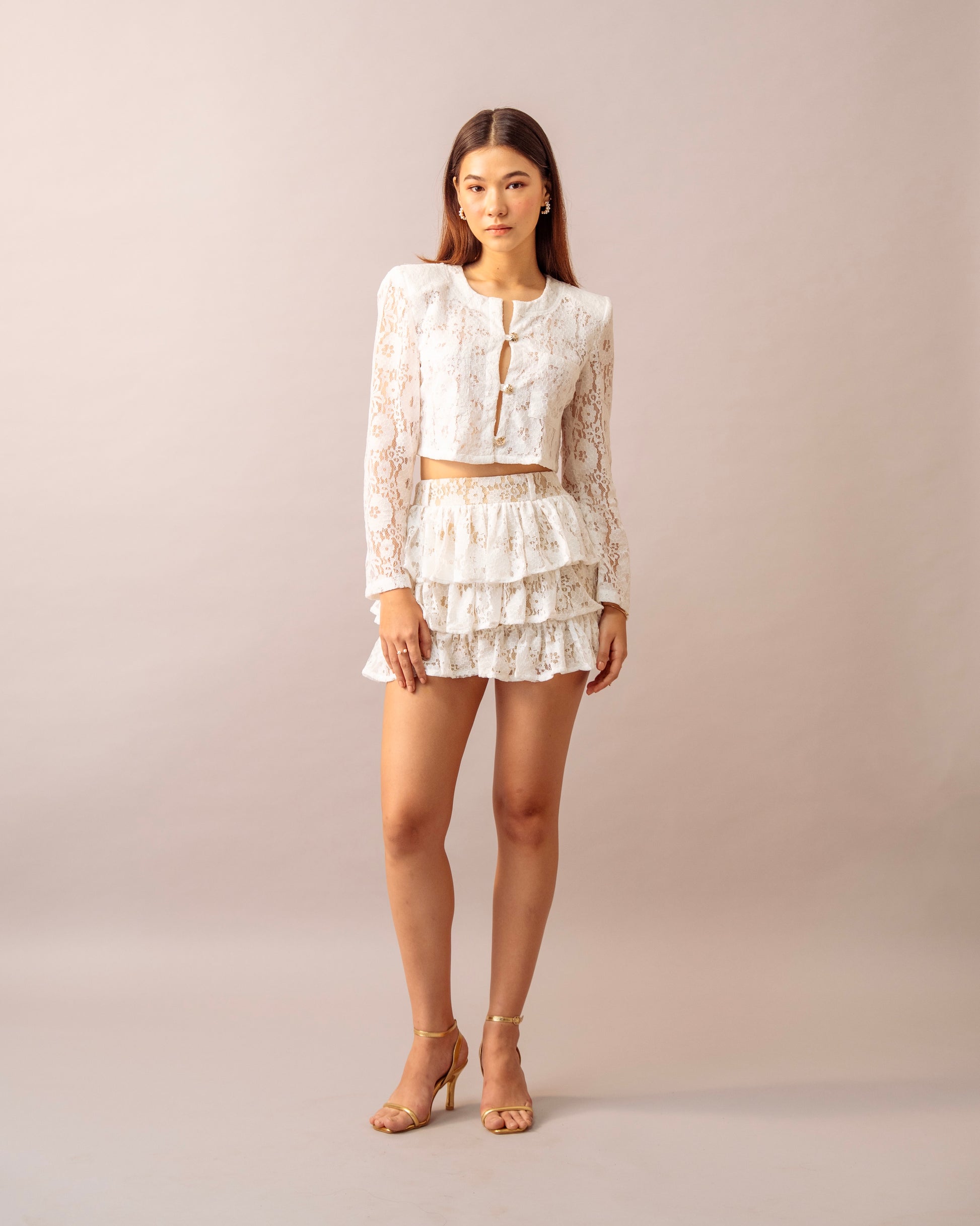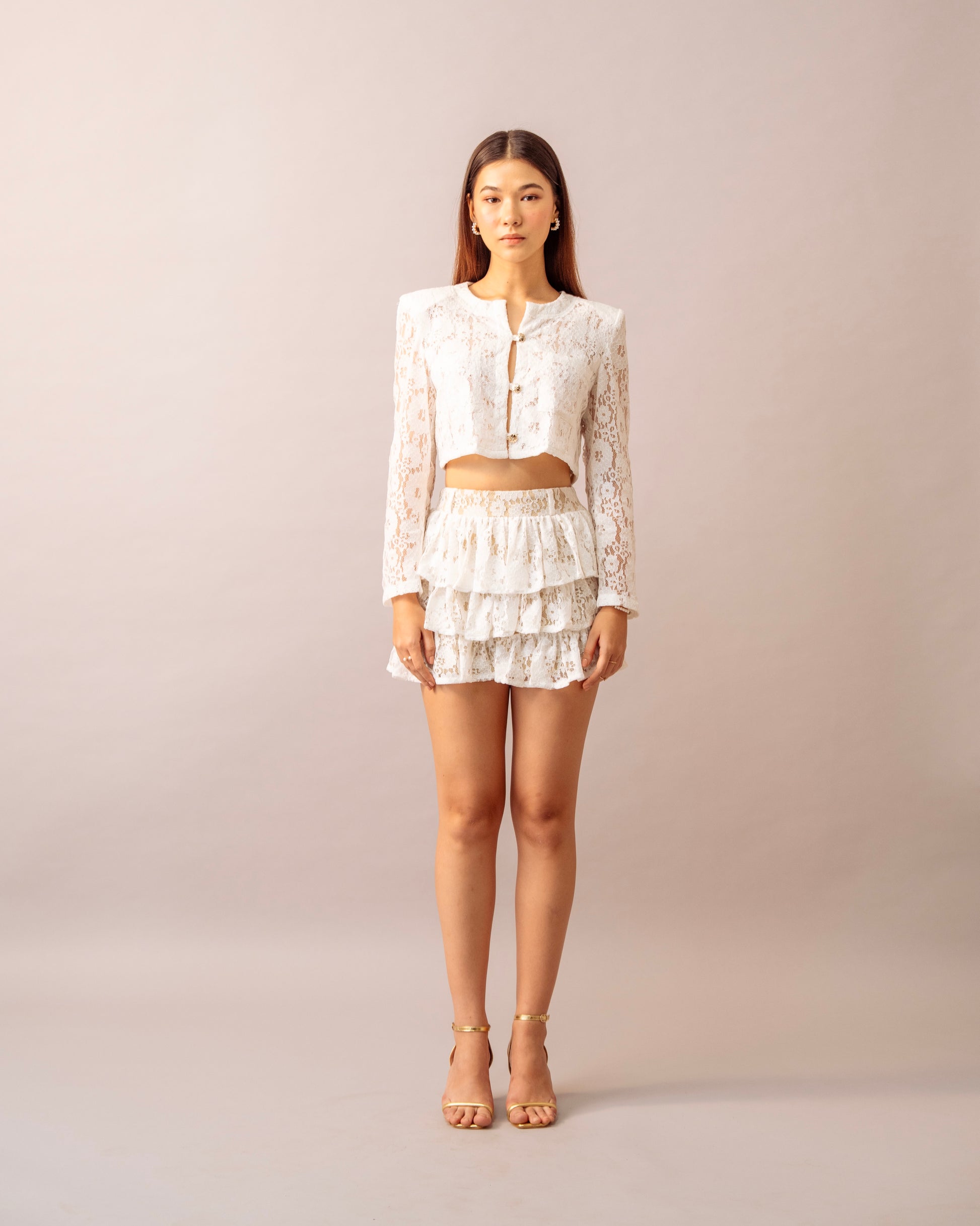 The Petal Light Lace Jacket is sculpted elegance — tailored through the accentuated shoulders and softened by scalloped lace edges. Dainty crystal gold buttons catch the light with every gesture, making it both nostalgic and new. The lace jacket is double lined and comes with a white lycra tube top that hugs your body and serves as a perfect inner for the airy weave